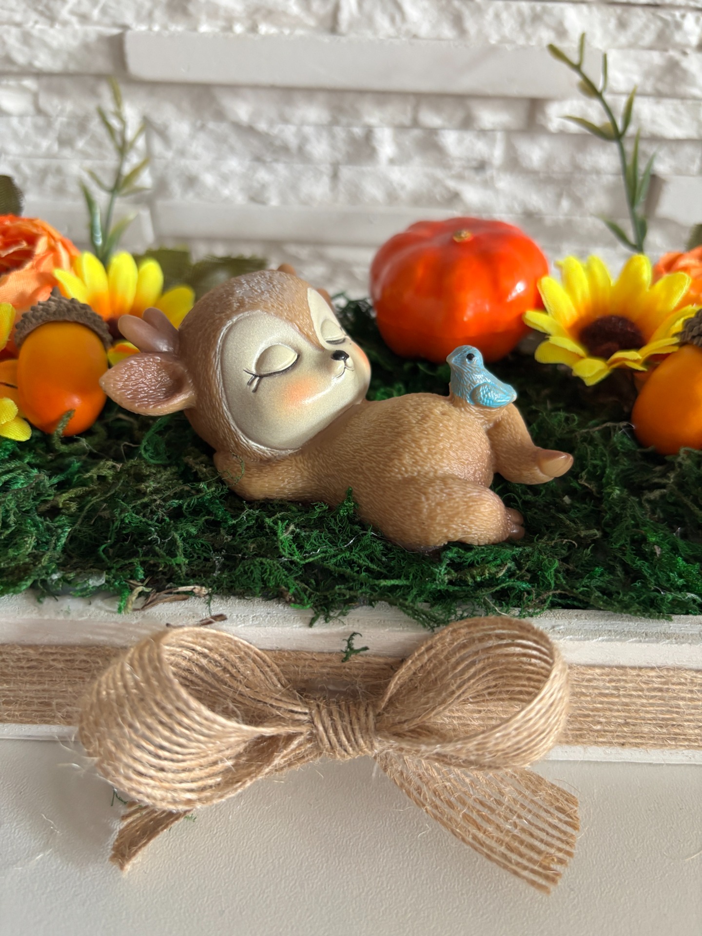 Ez a bájos őszi asztaldísz egy fehérre festett fadobozban rejtőzik, zöld mohával bélelt alapon, ahol egy édesen alvó őzgida pihen kis madárkával a lábánál. Körülötte sárga napraforgók, narancsos ranunkuluszok, apró tökök, makkok és egy piros pöfök gomba keveredik a lehullott levelekkel – igazi őszi mese, ami vidám meleget hoz az otthonodba!