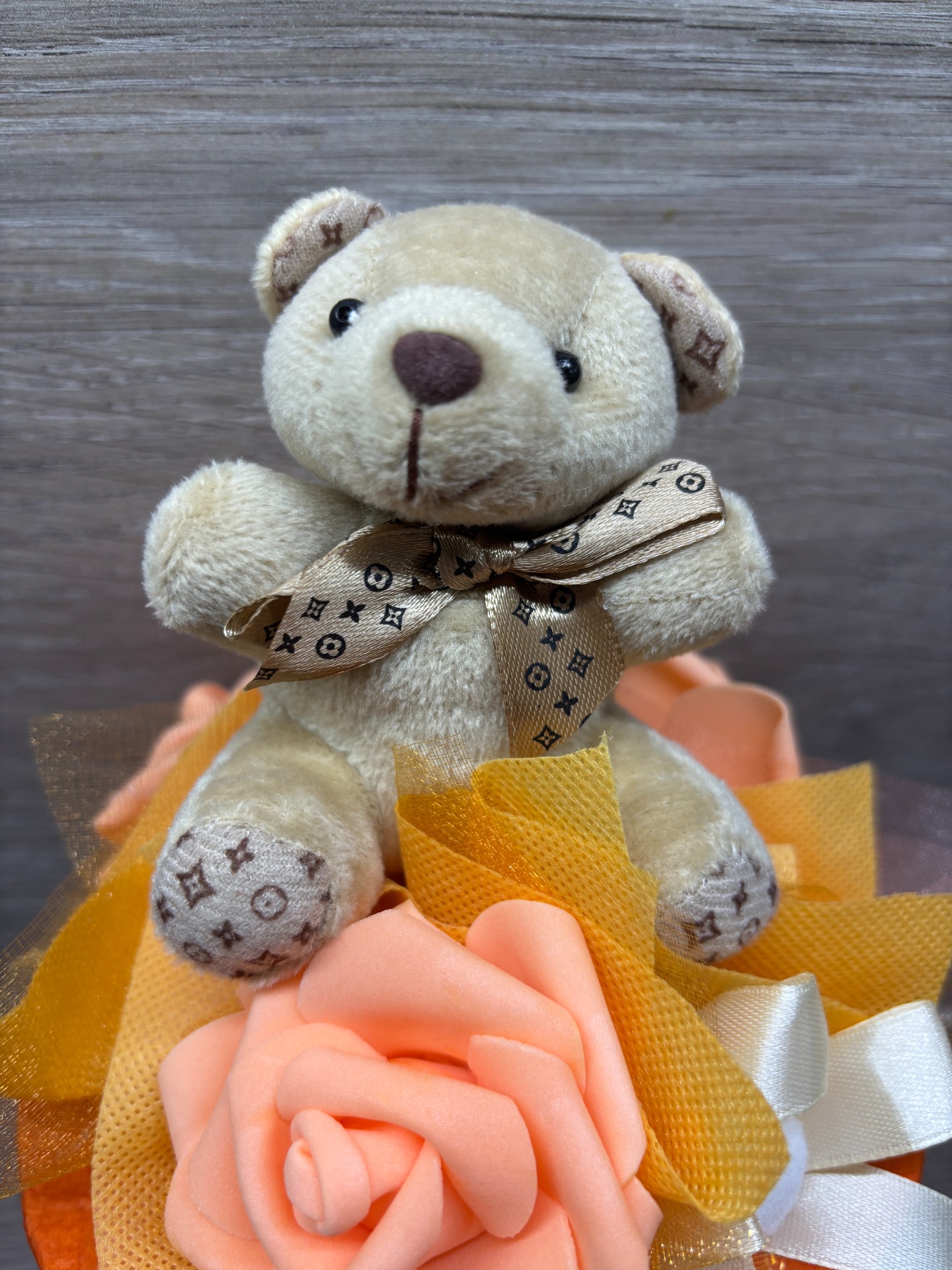 Ünnepelje a ballagást ezzel a megható, kézzel készült mellcsokorral, amely puha bájt visz a nagy pillanatba! A bézs plüss mackó – játékos pofával és kis masnival – a középpontban ül, körülölelve élénk narancs selyem rózsákkal és finom tüll szirmokkal, amelyek vidám hullámzást adnak. A fehér szalagok és a sárga fodrok elegáns kontrasztot teremtenek– ideális ajándék a mackós kedvenc végzősnek!