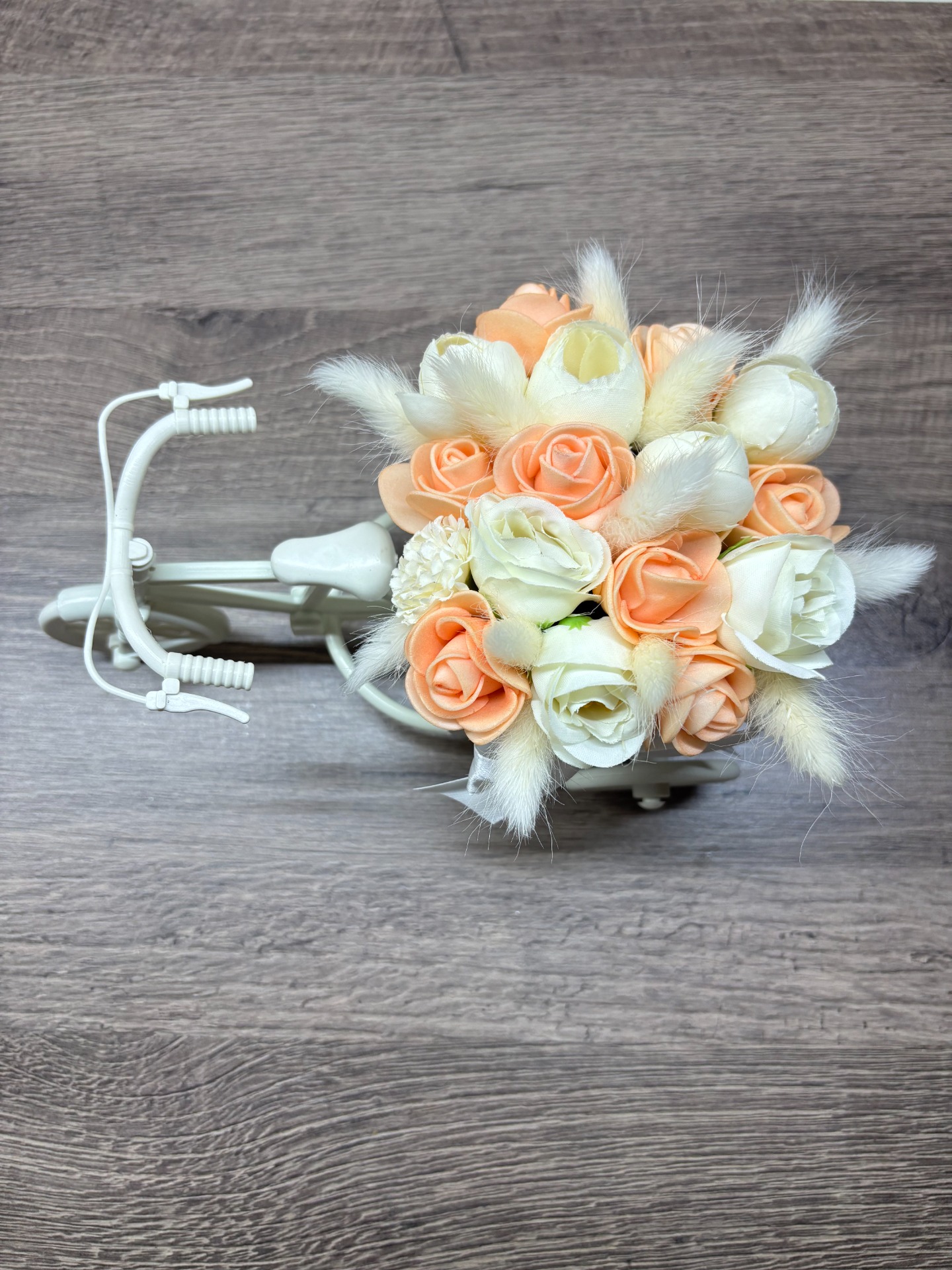 Ez a dekoráció egy romantikus, vintage hangulatú dísz, amelyet egy fehér, kerékpár formájú tartó tesz különlegessé. A kis kosárban barack és fehér árnyalatú műrózsák kaptak helyet, amelyeket finom, puha díszfüvek egészítenek ki. Az összhatás elegáns és bájos, kiegészítve egy szaténszalagból készült masnival. Tökéletes választás esküvői asztaldísznek, romantikus ajándéknak vagy otthoni dekorációnak, amely friss, üde hangulatot sugároz.