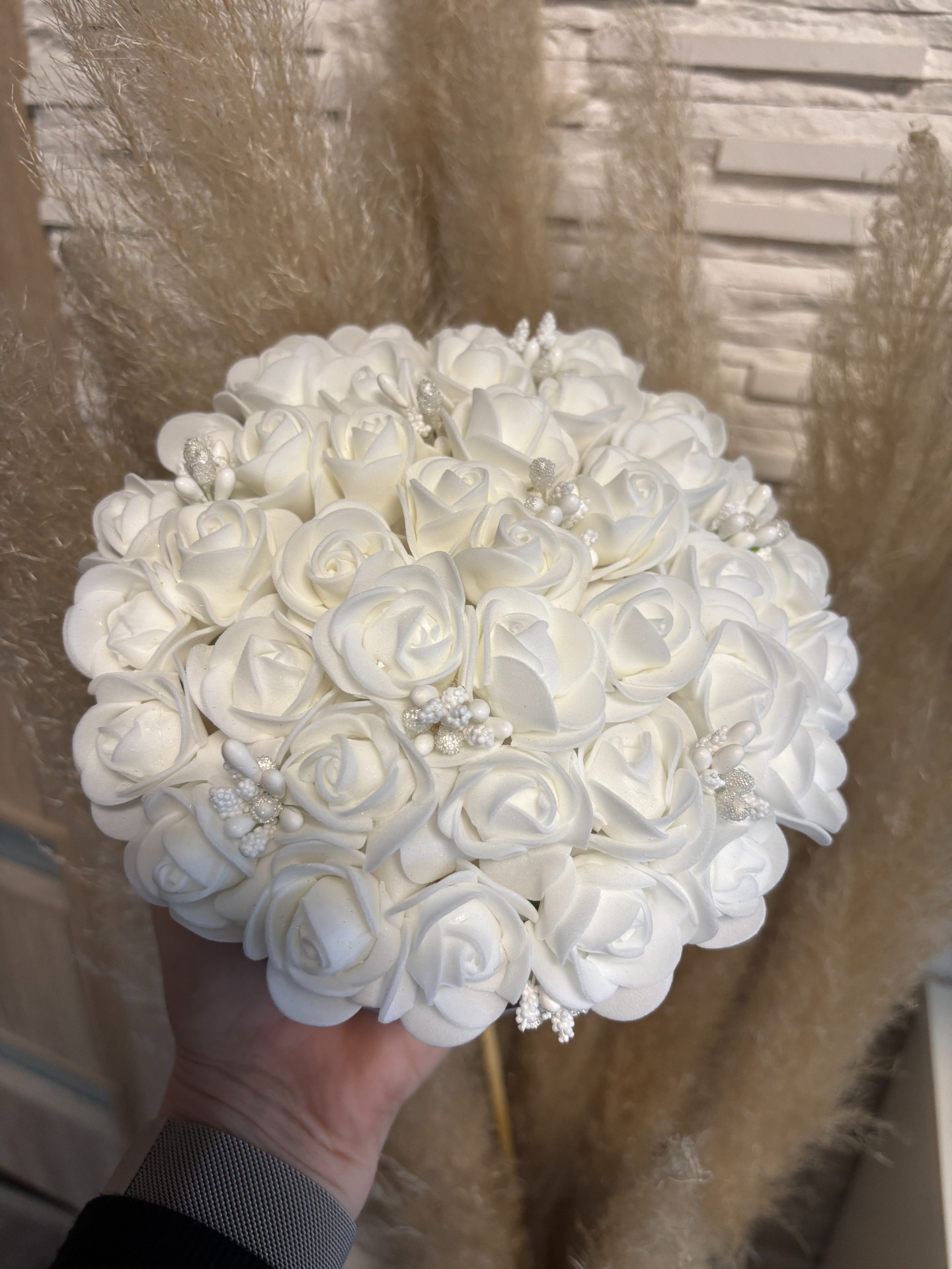 Ajándékozza meg szeretteit örök szerelmessel ezzel a romantikus, kézzel készített habrózsás kompozícióval, amely a "ONLY FOR YOU" üzenettel hirdeti a különleges pillanatokat! A dús fehér rózsák – finom gyöngyökkel díszítve – bimbóznak a bordó kerek doboz tetején, míg körülötte puha pampafű ágak adják a természetes, boho érintést, simulva a fehér téglafalhoz. Tökéletes évfordulóra, Valentin-napra vagy csak úgy meglepetésként – ahol a visszafogott luxus mosolyt csal az arcokra.