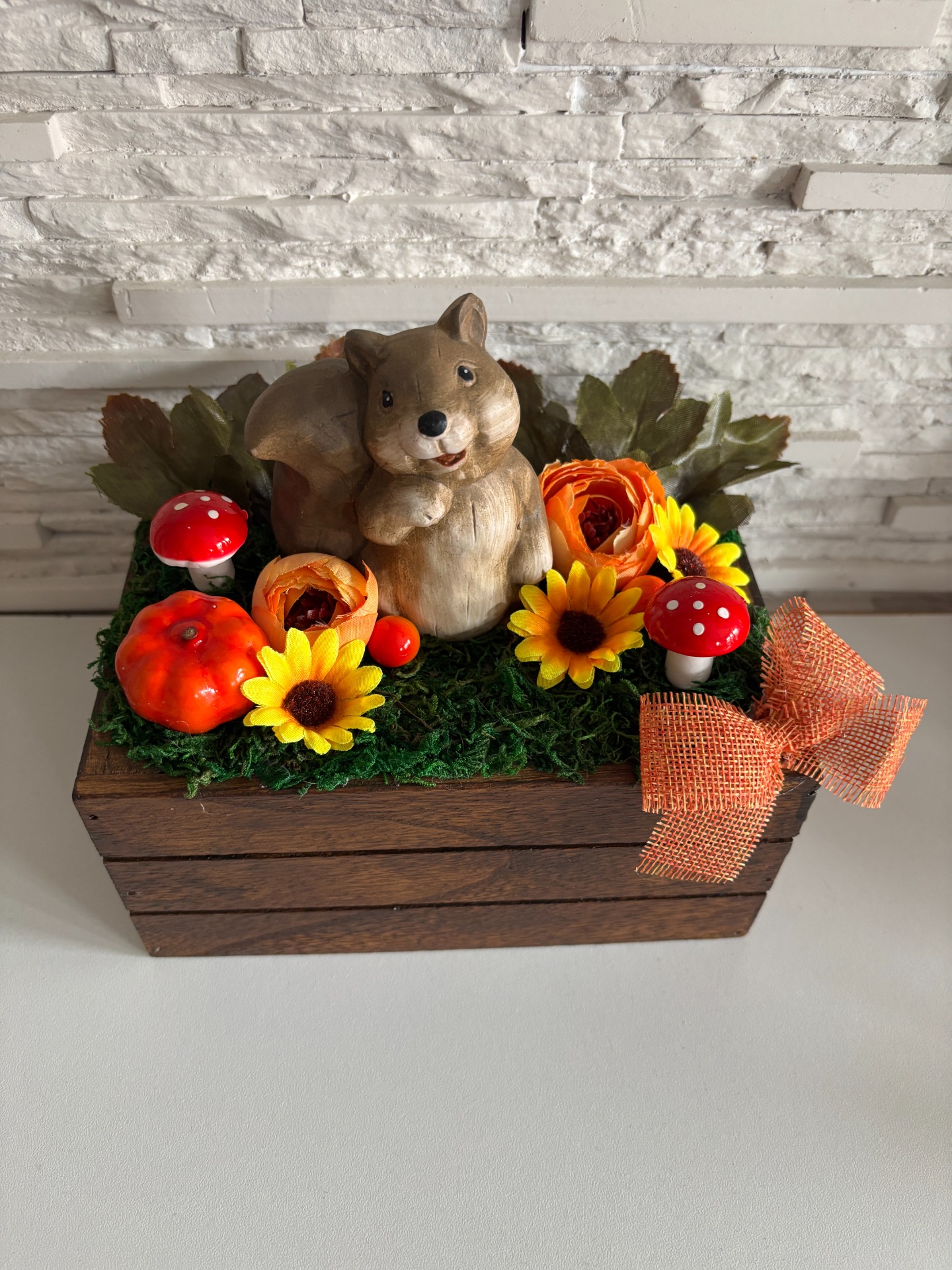 Ez a dekoráció egy rusztikus hangulatú, fából készült ládában kapott helyet. A kompozíció középpontjában egy kedves, mosolygó mókusfigura áll, amelyet élénk színekben pompázó művirágok, napraforgók és őszi hangulatú díszek, például piros kalapos gombák és dísztökök vesznek körül. A zöld mohapadló természetes hatást kelt, míg a narancsszínű masni barátságos, vidám hangulatot ad a dísznek. Ideális választás őszi asztaldíszként, otthoni dekorációnak vagy ajándéknak, amely melegséget és játékosságot visz bármely térbe.