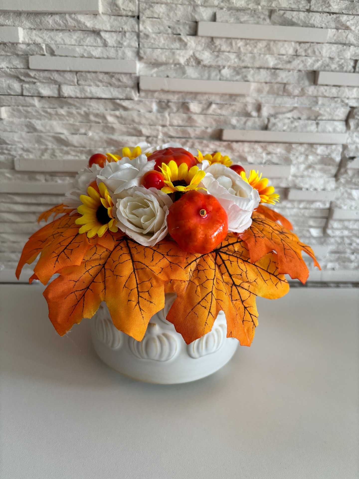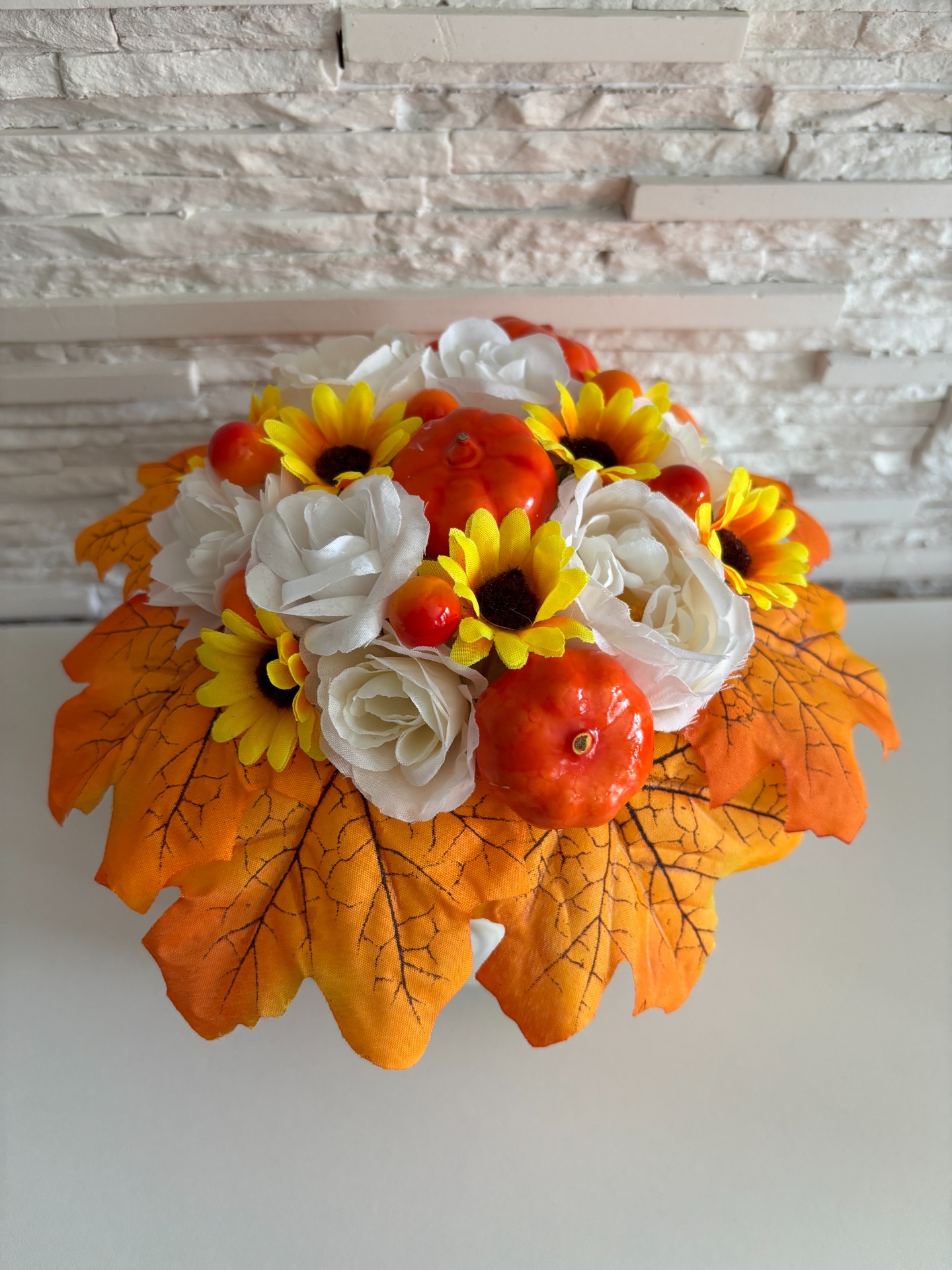 Képzelj el egy olyan őszi dekorációt, ami nem csak a szobát, de a lelkedet is betölti melegséggel! Ez a falra rögzített fehér váza igazi mestermű: sárga napraforgók pompáznak benne, fehéren ragyogó rózsák simulnak hozzájuk, piros gránátalmaszerű díszek adják a kontrasztot, miközben nagy, narancssárga juharlevelek keretezik az egészet, mintha a természet maga festette volna. A háttérben a világos téglafal finoman kiemeli a kompozíciót, így tökéletesen illeszkedik modern vagy rusztikus enteriőrbe is.