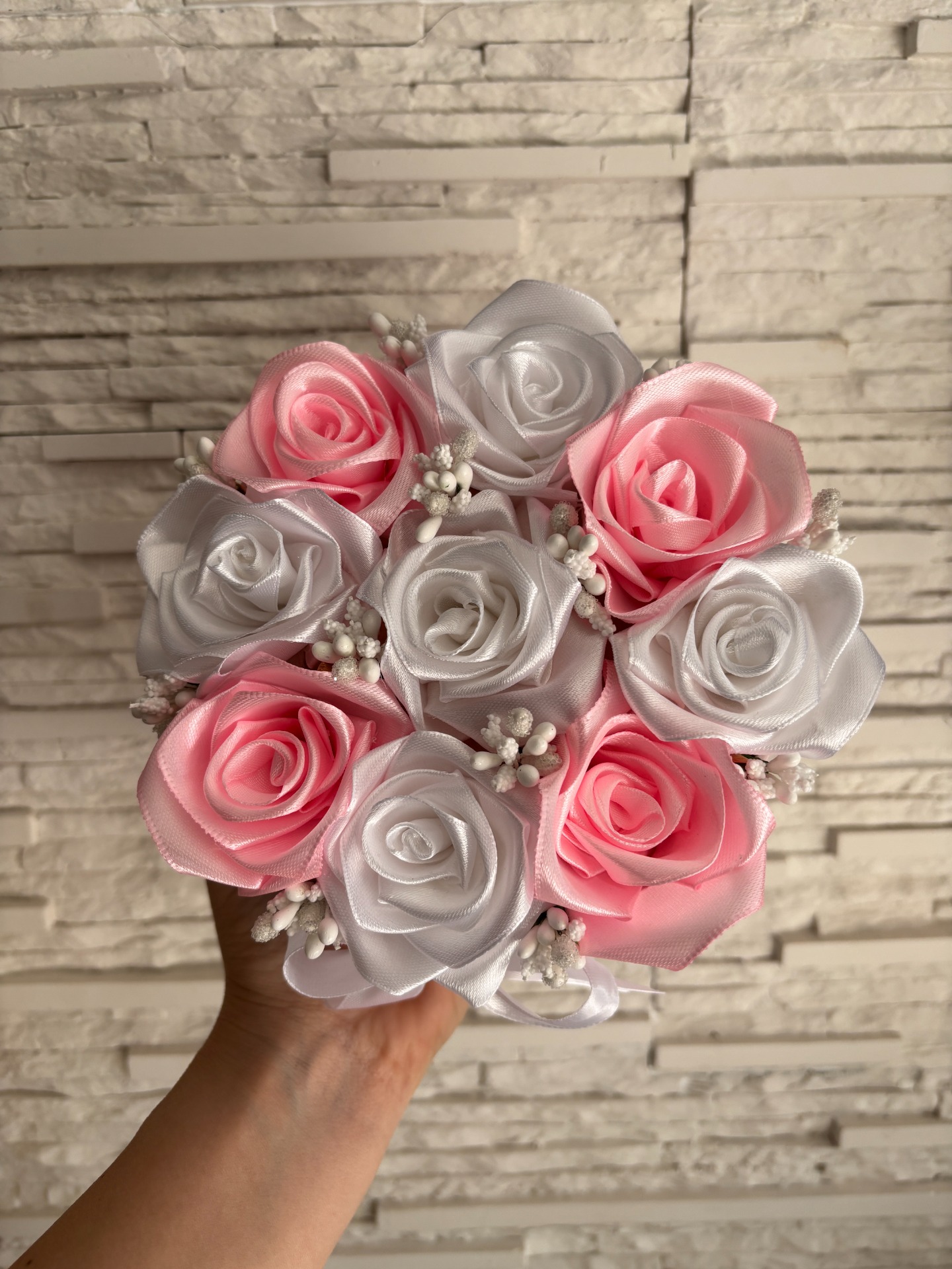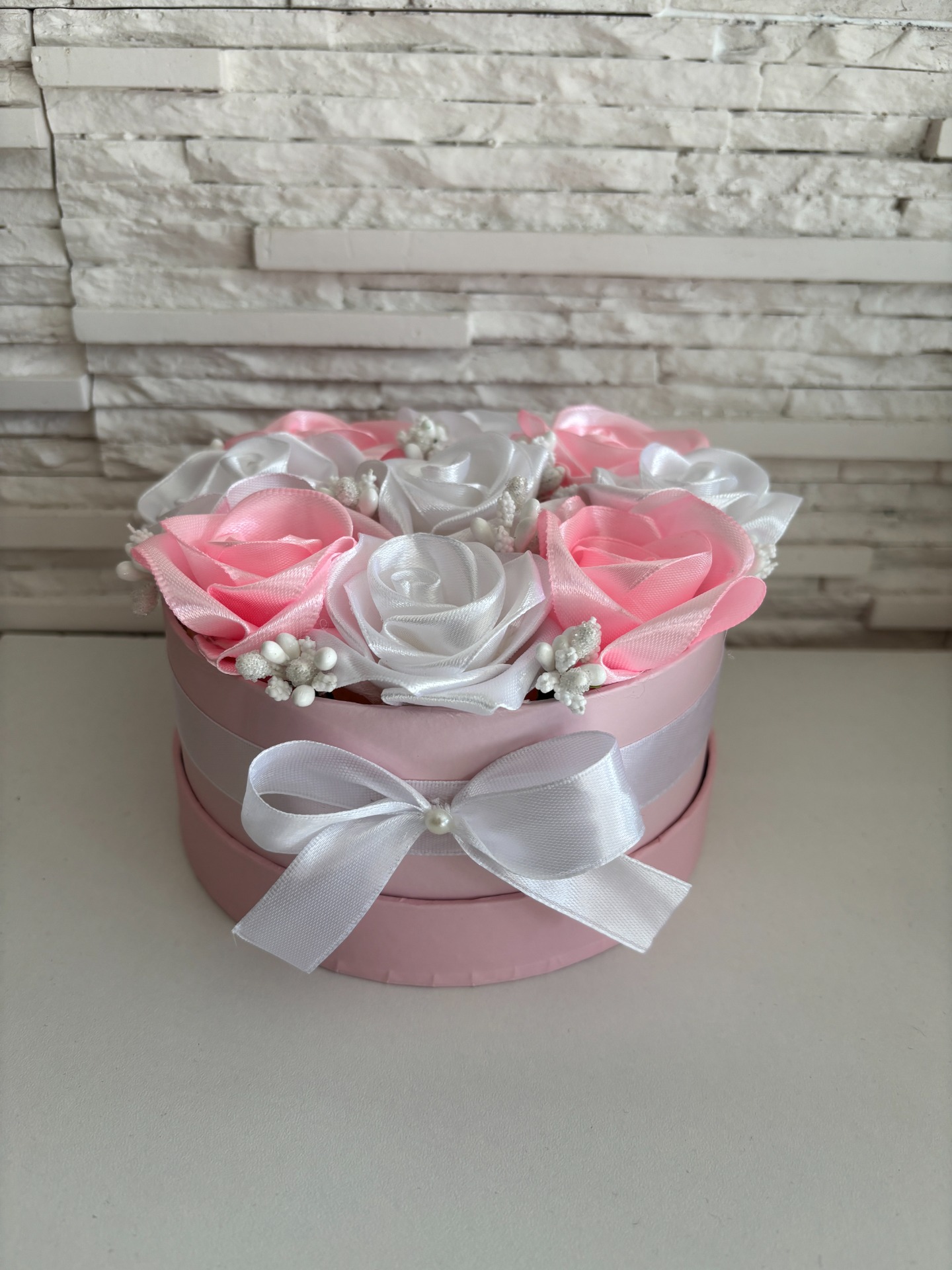 Ki ne szeretne egy kis romantikát a mindennapokba? Ez a bájos rózsaszín doboz tele van finom, mesterséges rózsákkal – hófehér és halvány rózsaszín szirmok keverednek, apró gyöngyök és fehér szalagok teszik még elegánsabbá. A háttérben a világos téglafal kiemeli a kompozíció puhaságát, mintha egy esküvői meghívó elevenedne meg a falon!