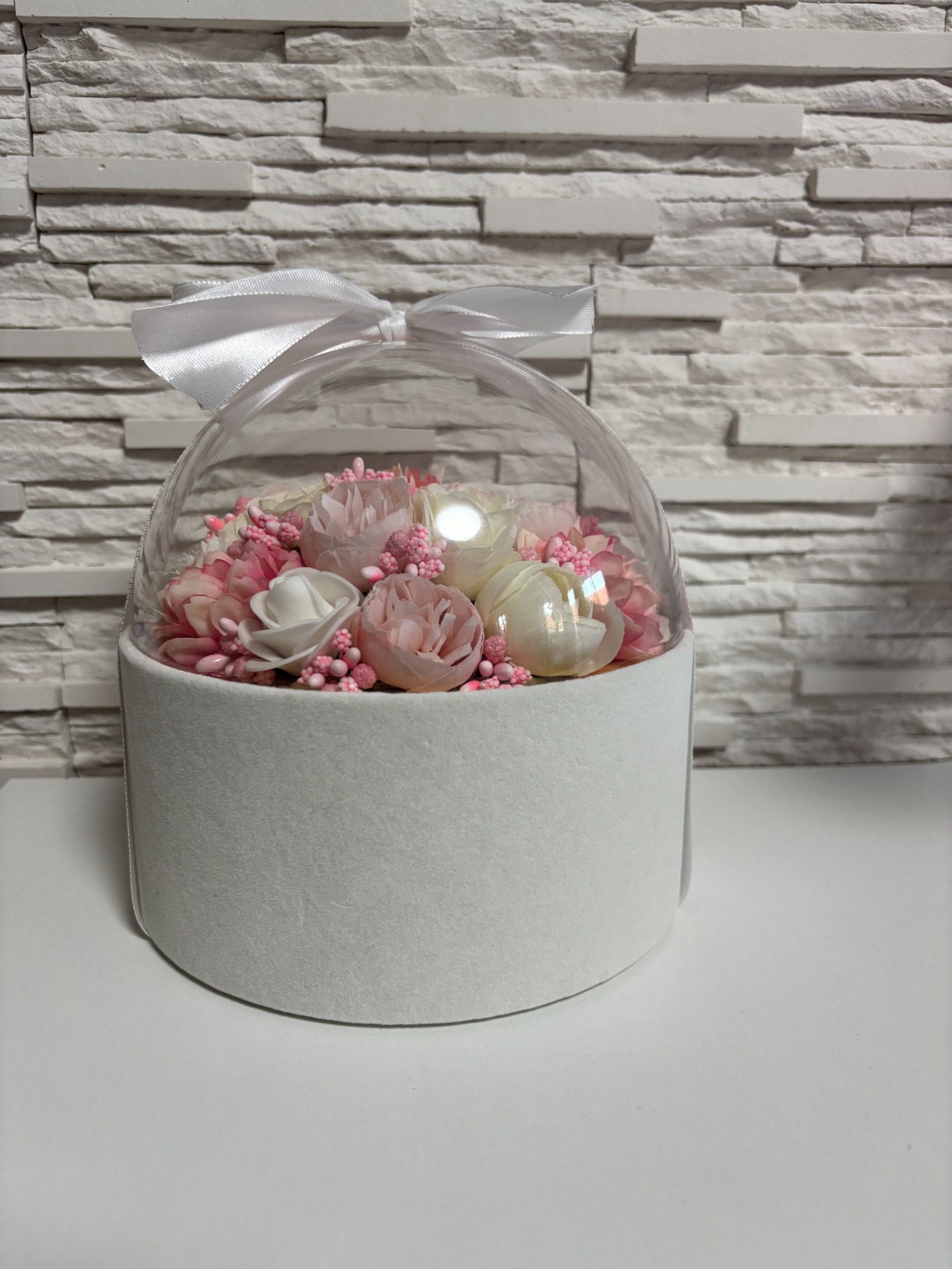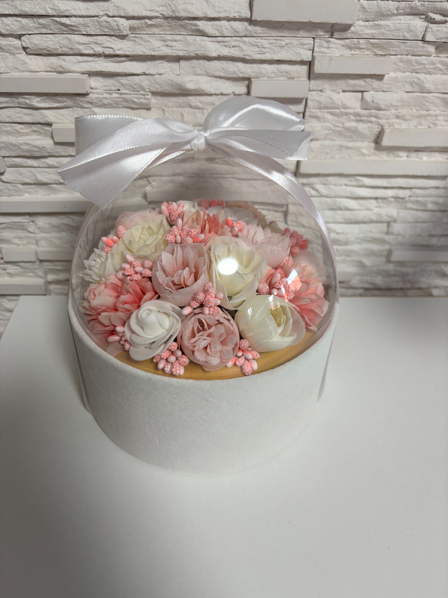 Egy igazi kis mese elevenedik meg ebben az üvegkupolában: finom rózsaszín, krémszínű és fehér mesterséges virágok – peóniák és rózsák keveréke – csillognak benne apró gyöngyökkel díszítve, mintha egy tündérmese részecskéje lenne. A fehér szalag kecsesen köti össze, miközben a háttérben hullámzó pampafű és a világos fal ad neki természetes, bohém hangulatot. Kézben tartva is lenyűgöző, de falra akasztva vagy asztalon trónolva igazi dekor-ikonná válik!